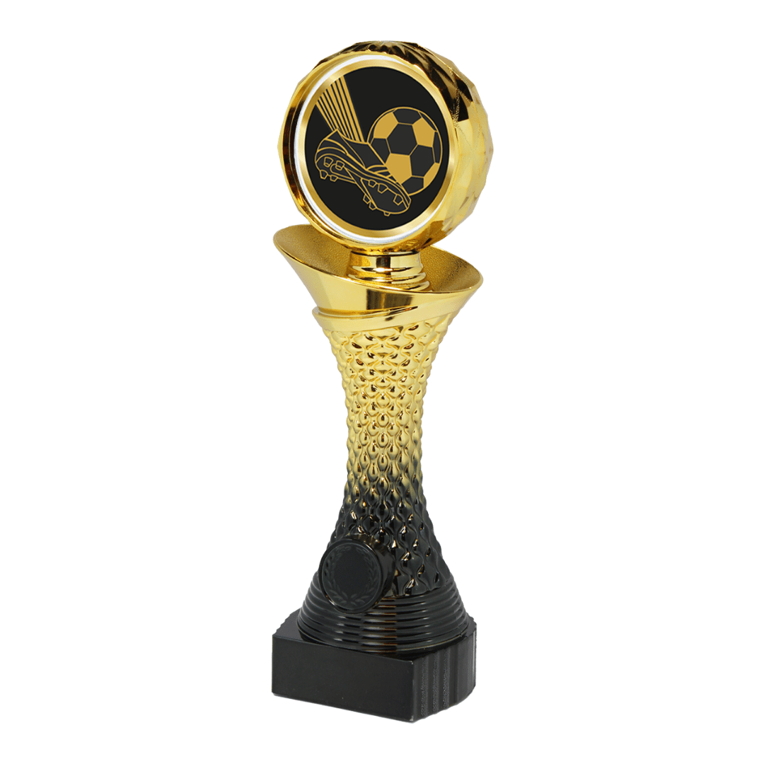 De goud-zwarte uitstraling geeft de trofee een luxe look, terwijl het kunststof materiaal de trofee betaalbaar houdt. Ideaal voor zowel jeugd- als seniorenteams.